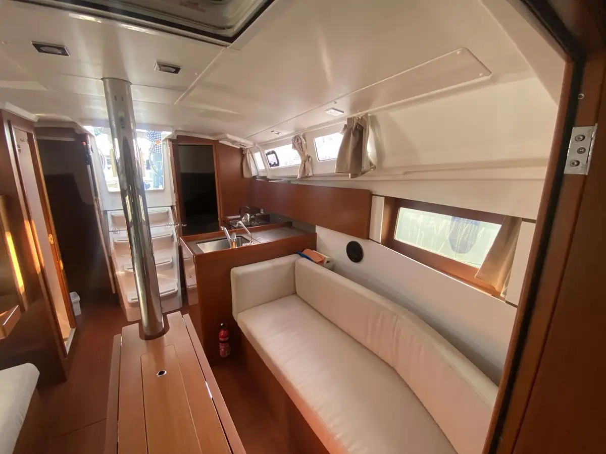 L'intérieur, signé Nauta Design, frappe immédiatement par sa clarté. La cuisine en L offre un véritable plan de travail fonctionnel, tandis que le carré transformable permet d'accueillir des invités supplémentaires en toute convivialité.