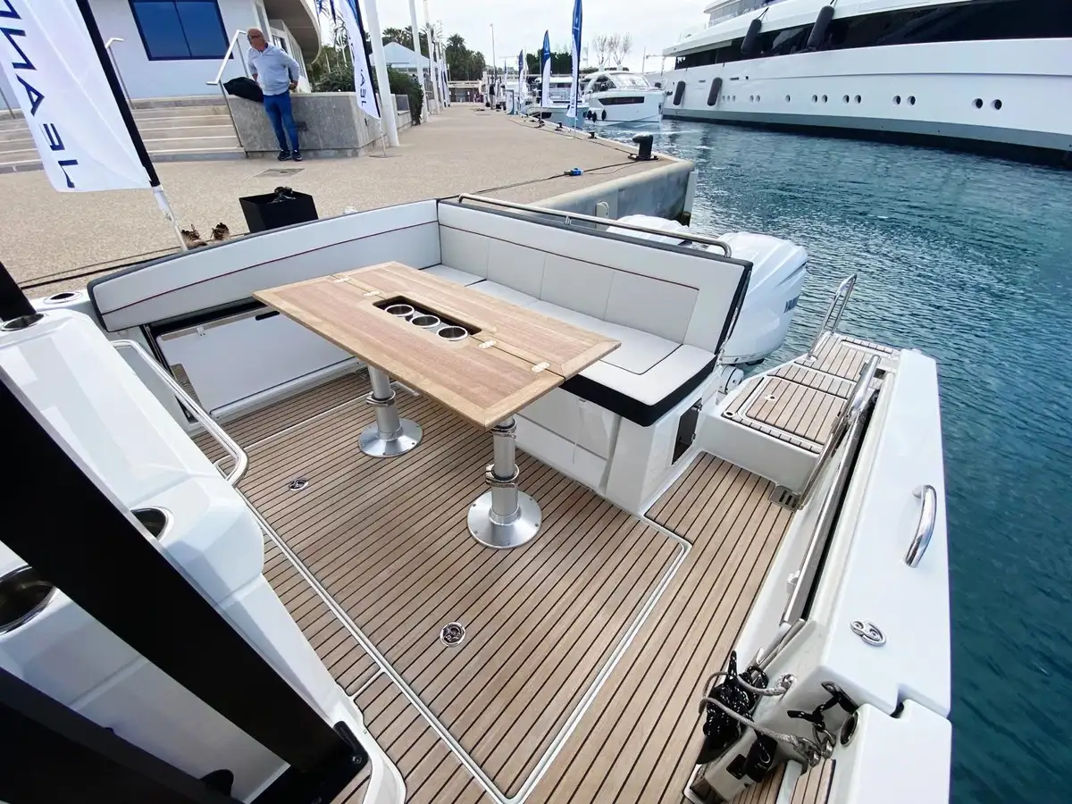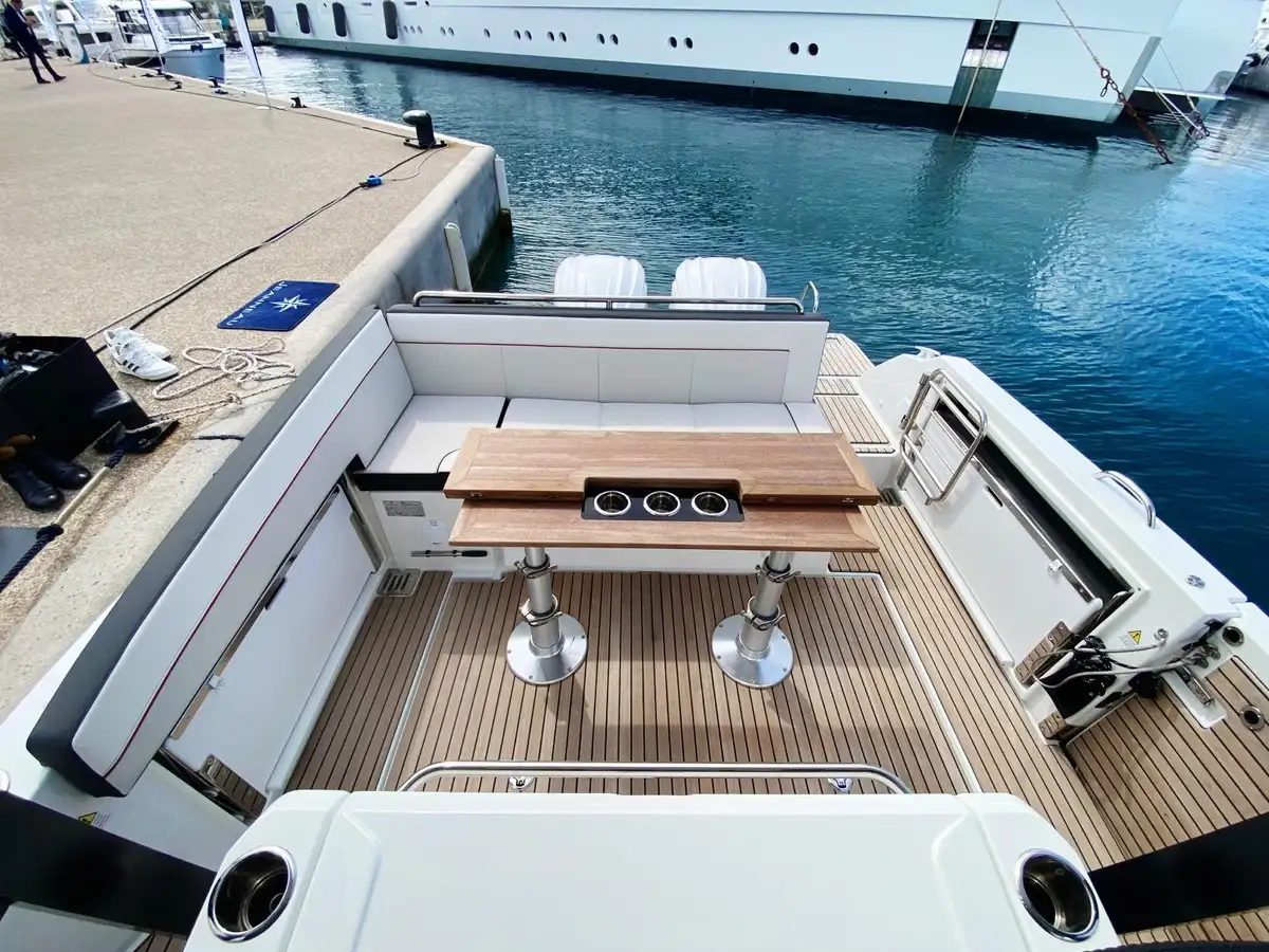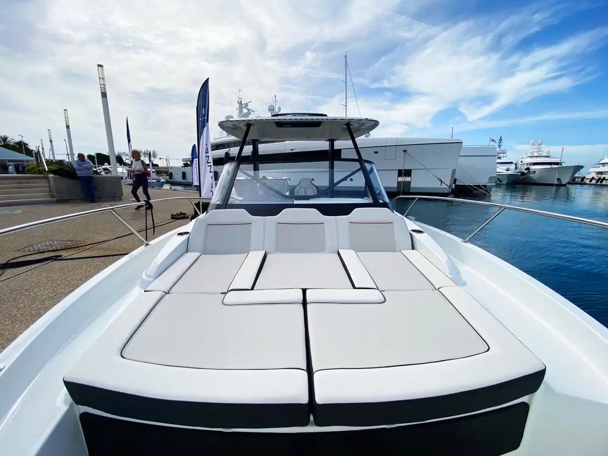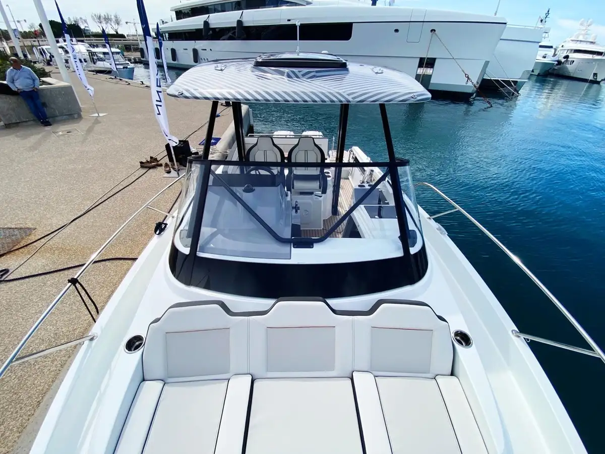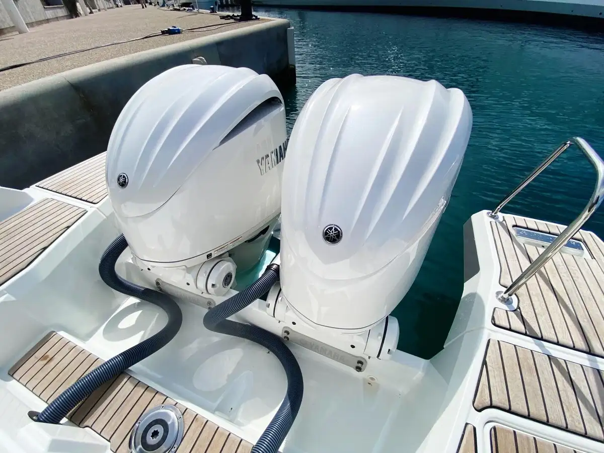 Nouvelle carène en V signée Michael Peters et bi-motorisation 2 X 250 NSB 2 SBW BLANCS pour des pointes à plus de 40 nœuds. Lignes élancées, T-top, pare-brise en verre protecteur. Style contemporain, élégant et sécurisé.