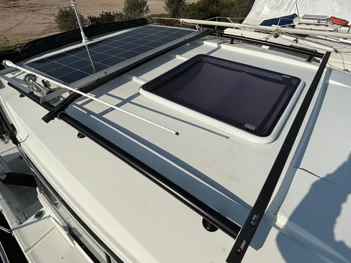 Très bien équipée : panneau solaire, convertisseur, galerie pour paddle sur le toit, casquette de soleil avec fermeture complète type camping, propulseur d’étrave, prise de quai 220V avec chargeur, guindeau électrique, GPS sondeur GARMIN avec cartographie, douche avec chauffe eau, WC marin avec réservoir eaux noires, cuisine luxe avec réchaud gaz et réfrigérateur 40L , complément de couchage dans le carré, prises 12V et 220V, table extérieure, plateformes de bain et circulation sécurisée.