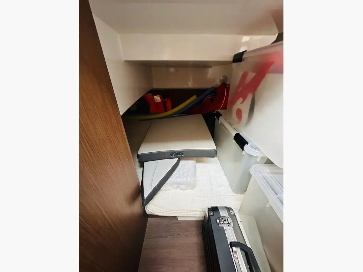 À l’intérieur, vous bénéficiez d’un carré transformable en couchage double, d’une cabine avant optimisée avec rangements, d’une cabine invités occupant toute la largeur du bateau, ainsi que d’une cuisine équipée avec évier, réchaud et réfrigérateur 60 L. L’ensemble offre un véritable confort pensé pour la croisière.