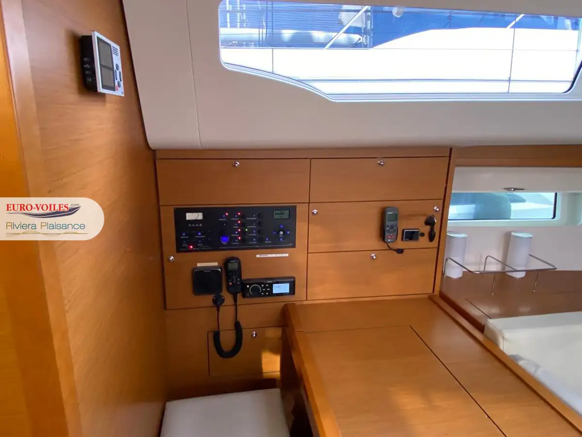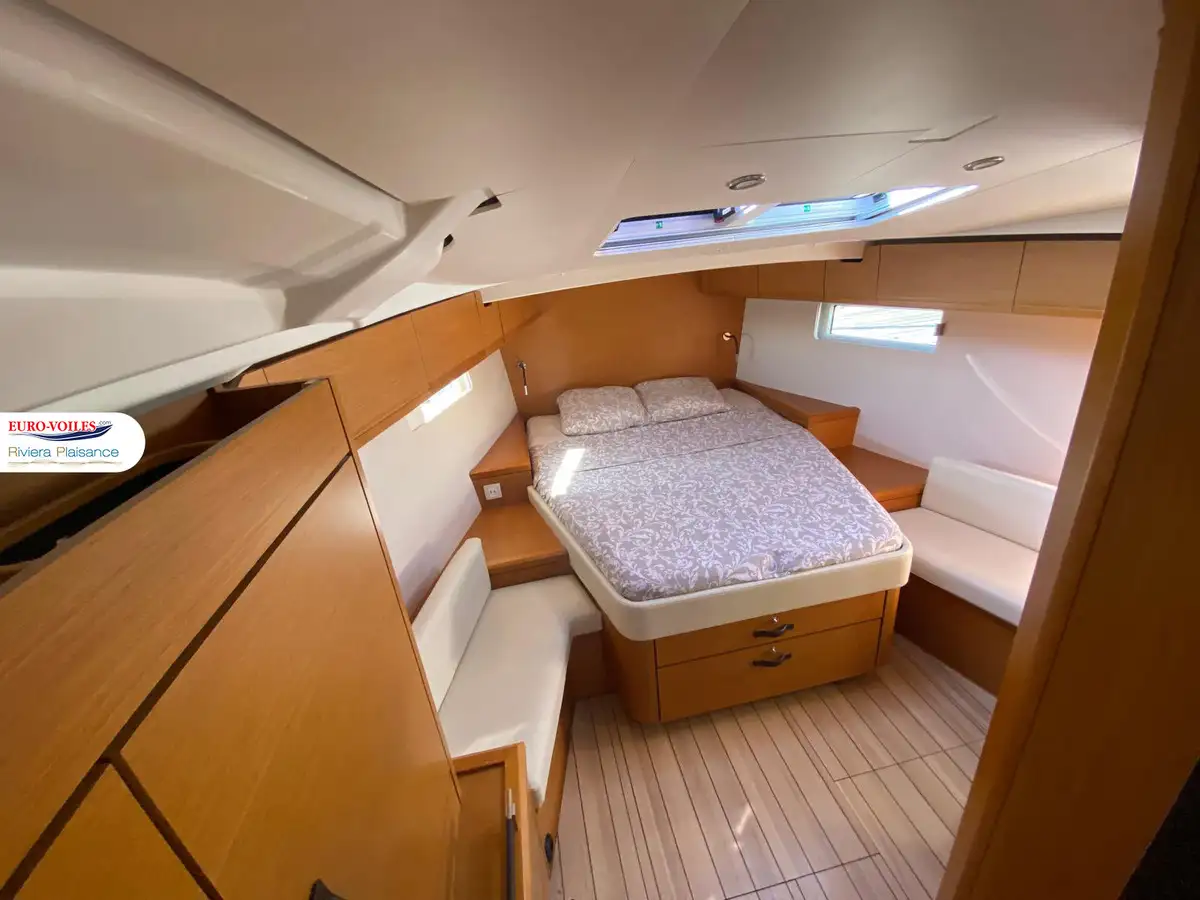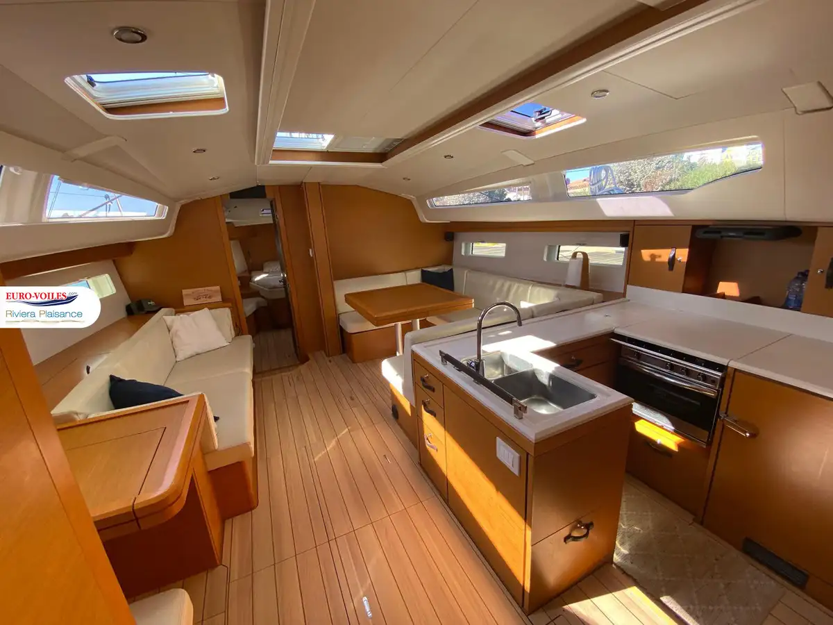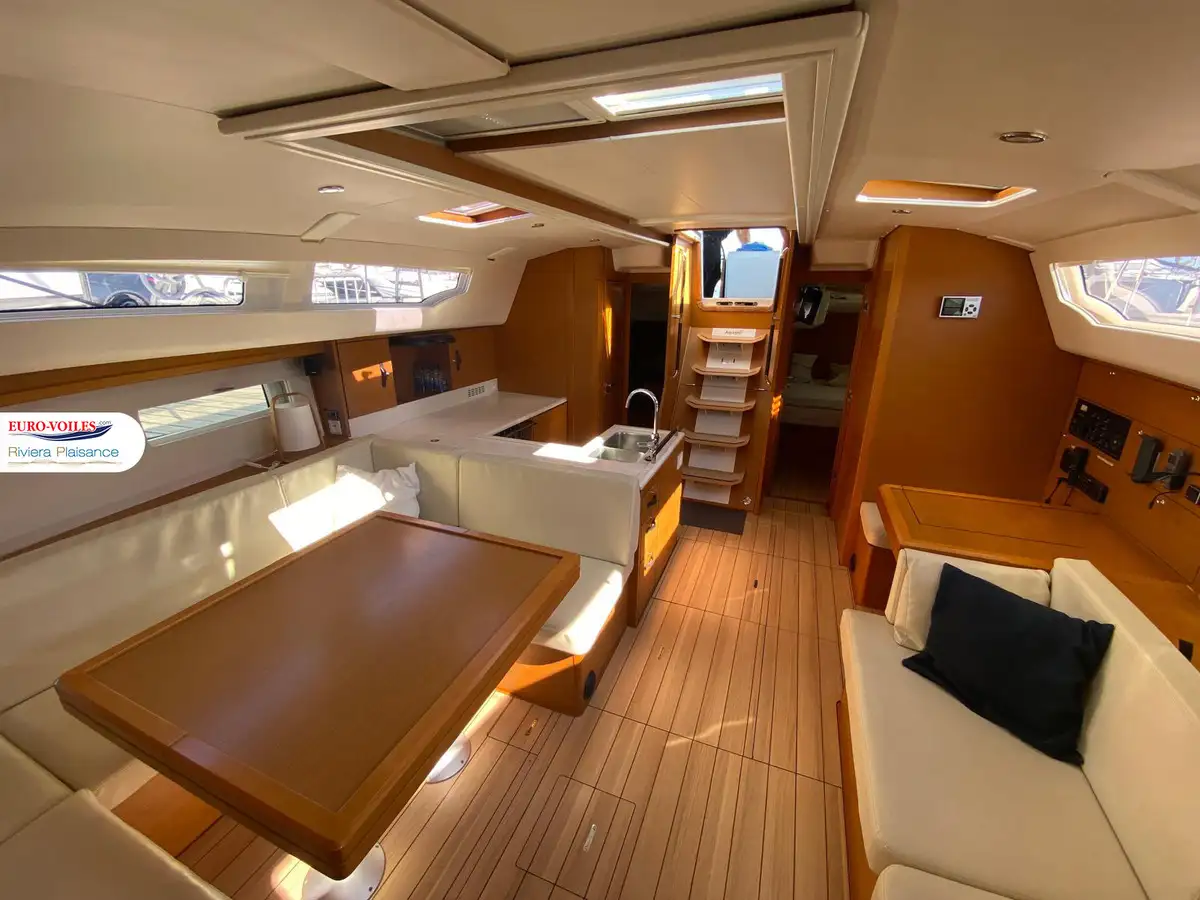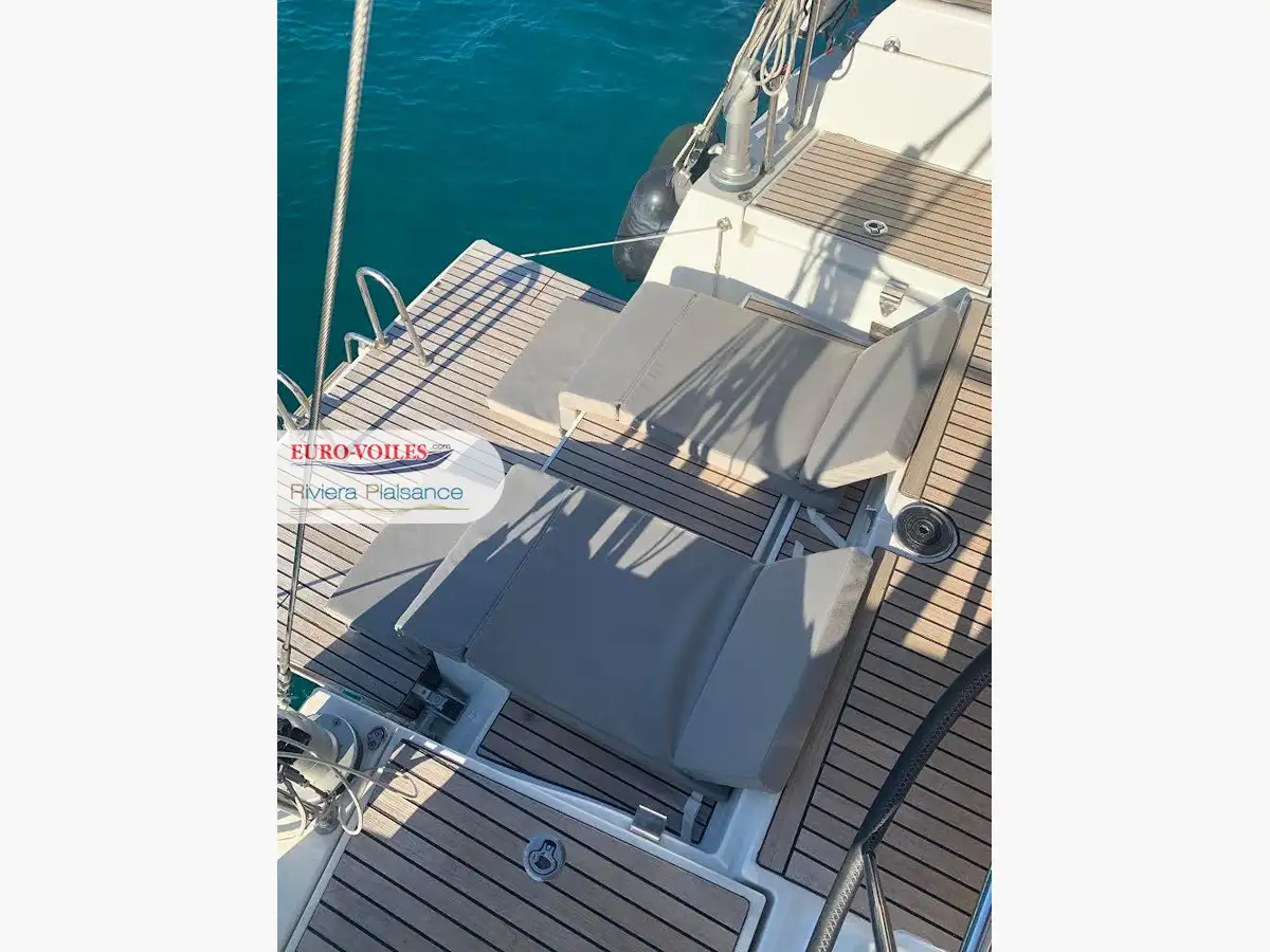 Le cockpit est XXL. Avec deux méridiennes de part et d’autre de la descente, très large table pour recevoir. Double poste de pilotage séparé de la zone cockpit pour se faire plaisir a la navigation. Bateau dynamique et très simple d’utilisation grâce entre autres à sa grand-voile sur enrouleur.