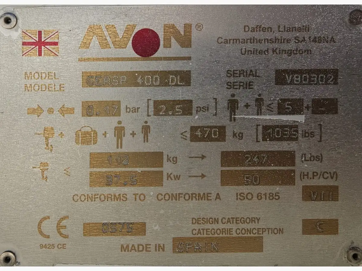 Avon Seasport 400 DL semi-rigid dinghy (Deluxe series), ideal as a yacht tender or for day trips. This model is renowned for its durability, comfort, and exceptional seaworthiness.