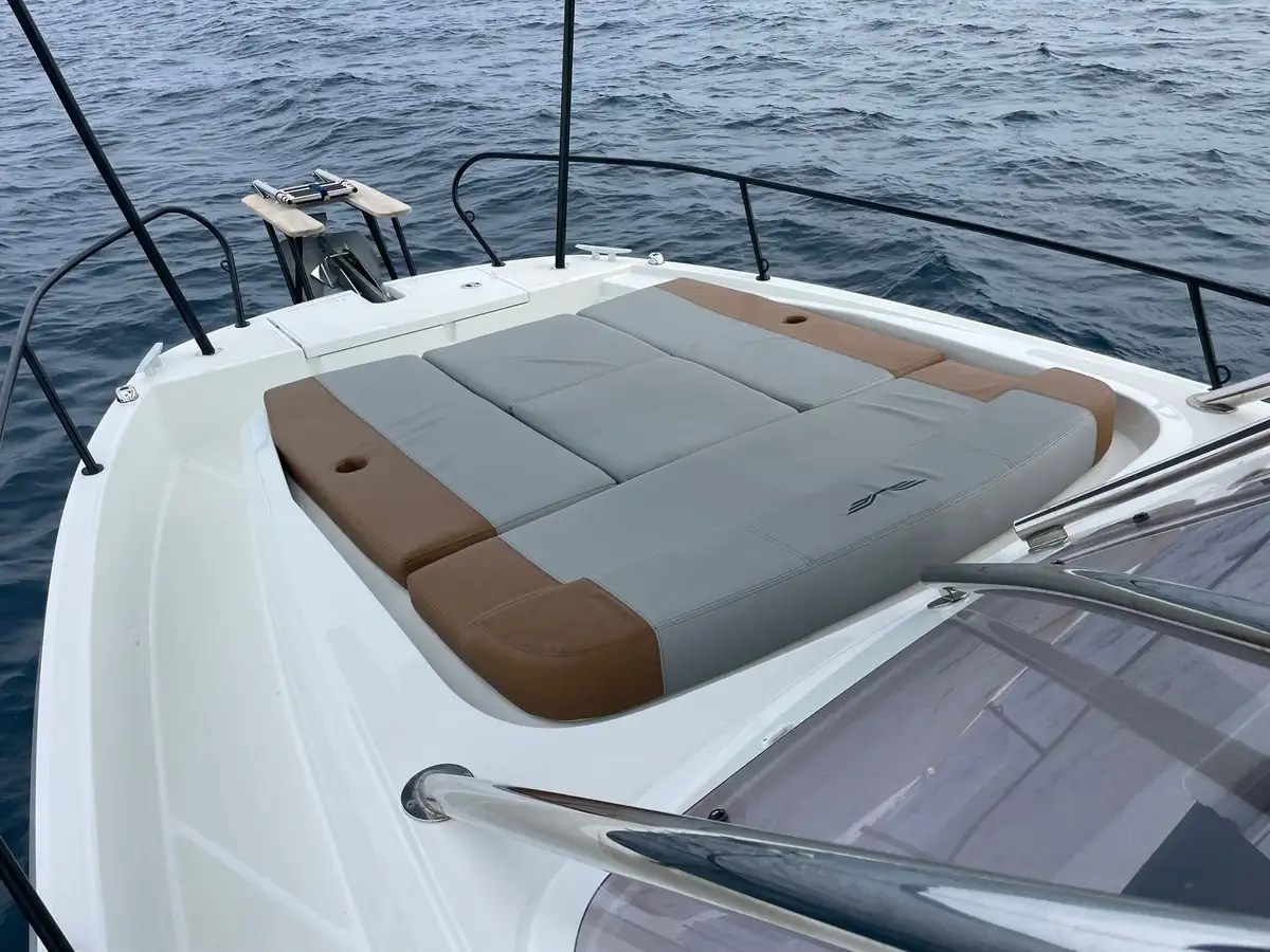 Full equipment includes Garmin GPS/plotter, fixed VHF, bow thruster, Zipwake automatic trim tabs, electronic engine controls, audio system, interior and exterior refrigerators, an outdoor galley protected by the windscreen return, large forward and aft sunpads, and safe circulation thanks to the deep portside walkway, making her ideal for family use.