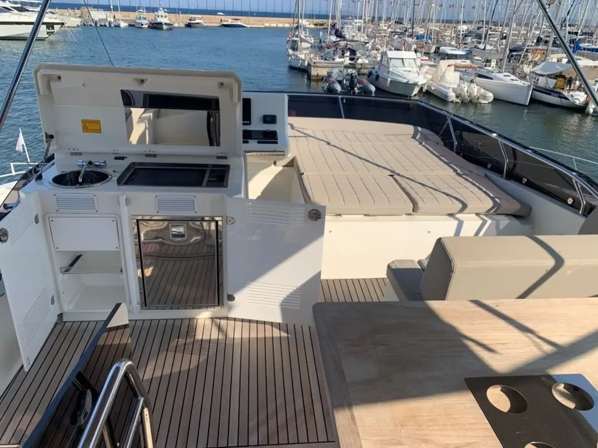 Flybridge galley with refrigerator and electric grill